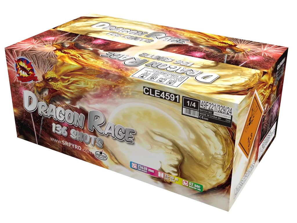 Ohňostroj Dragon Rage je extra silný kompaktný ohňostroj určený pre tých najlepších, ktorí chcú spraviť zo svojej oslavy naozaj nezabudnuteľnú párty. 136 extra silných rán ráže 25 a 30 mm poskytuje mohutný vizuálny efekt v tvare vejára, v ktorom sa striedajú rôzno-farebné efekty prevažne v zlatej a striebornej farbe s mínovým efektom počas približne 60 sekúnd trvania. Tento zložený ohňostroj patrí do profi kategórie a je ideálny pre novoročné oslavy, svadby, firemné eventy alebo akúkoľvek veľkú párty, kde hľadáte spoľahlivý a pôsobivý ohňostroj.